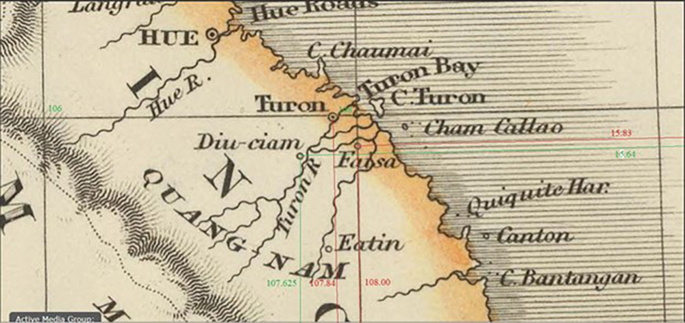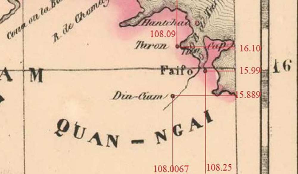 2. Tọa độ của ba thành phố Đà Nẵng, Hội An và Dinh Chiêm từ các bản đồ cổ (Hình 1-6) không chính xác. Kết quả từ các bản đồ cổ cho thấy khoảng cách giữa Dinh Chiêm và Hội An là từ 28 km đến 72 km, xa hơn 8-9 km mà chúng tôi ghi nhận từ sách vở của các giáo sĩ Ki tô Giáo, các nhà ngoại giao hay nhà thám hiểm vào thời xưa. Tuy nhiên, từ những bản đồ xưa, chúng ta biết vị trí liên đới giữa những thành phố này rất mật thiết với nhau. Hãy xem Bảng 2 với những kết quả được tóm tắt sau đây: