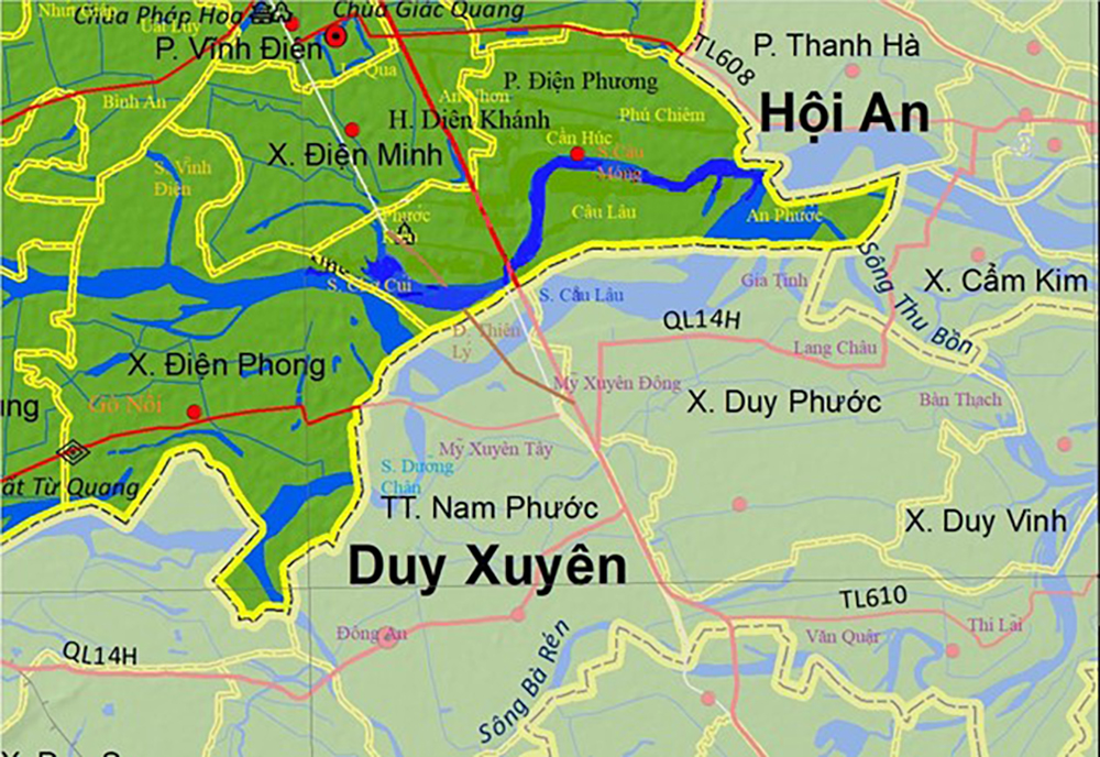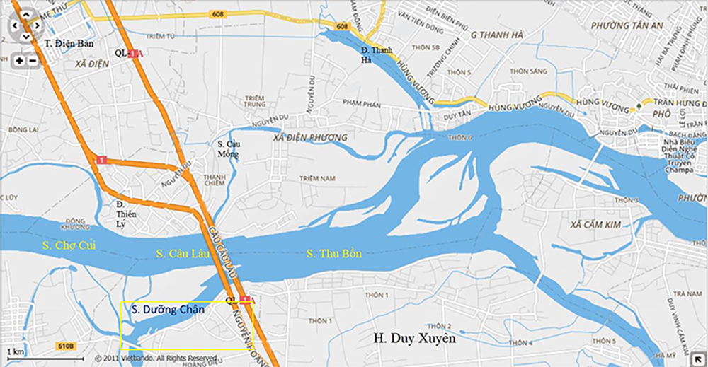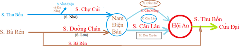 Sau đây là một sơ đồ tượng trưng cho hệ thống sông Thu Bồn khi nó đi ngang qua miền nam Điện Bàn rồi chảy về hướng Hội An, và cuối cùng, đổ ra Cửa Đại: