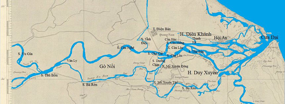 Hình 15 tiêu biểu sông ngòi ở vùng nam Điện Bàn và Hội An vào năm 1930. Hệ thống Sông Thu Bồn là một trong số sông dài nhất tỉnh Quảng Nam và miền Trung (200 Km) bao gồm hai con sông chính có tên là Sông Vu Gia (còn được gọi là Sài Thị Giang) và Sông Thu Bồn. Hai con sông này xuất phát từ miền thượng du trong dãy núi Trường Sơn. Sau khi nhập làm một tại thôn Giao Thủy134, nhưng không bao lâu khi nó chảy đến xã Văn Ly135, trước khi gặp Gò Nổi lại tách đôi nữa để thành nhánh Sông Thu Bồn rẻ về hướng đông bắc, còn nhánh còn lại tẻ về hướng đông nam được gọi là Sông Bà Rén (còn gọi là Sông Cái). Cả hai nhánh chảy song song về hướng đông vòng theo Gò Nổi. Khi sắp rời Gò Nổi thì nhánh sông Thu Bồn, ở phương bắc, tiếp tục chảy về hướng đông và đổi tên thành sông Câu Nghê, sau đó, thành sông Điện Bình khi qua xã Câu Nhi (hay Câu Nhí) và cuối cùng thành Sông Chợ Củi chảy dọc theo bên đường Thiên Lý ở miền nam Điện Bàn. Nhắc đến nhánh thứ hai, khi qua khỏi Đông Giáp, Sông Bà Rén lại chia làm hai nhánh phụ; nhánh lớn hơn chảy về hướng đông nam, ngoằn ngoèo để cuối cùng đổ vào vịnh Hội An trước khi ra Cửa Đại – nhánh này vẫn gọi là Bà Rén. Còn nhánh phụ nhỏ, ngắn hơn là Dưỡng Chân chảy lên hướng đông bắc; một chi nhánh của sông Dưỡng Chân đổ vào Huyện Duy Xuyên thành Sông Kẻ Thử (hay còn gọi là Kẻ Thí) đổ ra sông Câu Lâu ở phía bắc; con sông này bị tắc nghẻn từ lâu lắm rồi, nhưng nhánh lớn Dưỡng Chân hơn vẫn tiếp tục chảy lên đông bắc gặp và sát nhập với Sông Chợ Củi để cả hai đổ vào hai con sông lớn; một trong hai sông này là sông Câu Lâu (ngang Cầu Câu Lâu) chảy thẳng về hướng đông. Dòng còn lại là Sông Cầu Mống chảy vòng lên phía đông bắc bao bọc chung quanh gò nổi xã Câu Lâu (nay là Điện Phương Đông). Hiện nay, Sông Cầu Mống hầu như bị khô cạn.