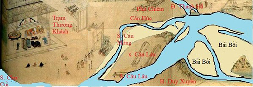 | 1640 | 2 | nhỏ | bãi bồi | lớn | lớn | Duy Xuyên | Hình 19 – Chi tiết từ Tranh Chaya. Vào năm 1640, xã Câu Lâu có thể lệ thuộc huyện Duy Xuyên vì địa phận của nó nối liền với bãi bồi Câu Lâu và xã Mỹ Xuyên thuộc huyện Duy Xuyên ở phía nam. |