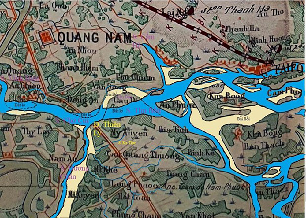 Trước nhất, khi quan sát kỹ lưỡng tấm bản đồ này, chúng tôi nhận thấy, giống như trong đầu thế kỷ 17 trên tranh Chaya, địa lý miền nam Điện Bàn vào lúc đó khác với hiện nay. Con sông Câu Lâu chảy ngang qua huyện Duy Xuyên bỗng nhiên biến mất. Thay thế vào đó là một bãi bồi rộng mênh mông nối liền gò nổi Câu Dẫn – Chúng tôi nghĩ đây là lỗi chính tả hay cái tên “Câu Lâu” bị đổi tên thành “Câu Dẫn”? Nay là một phần của phường Điện Phương – ở phía bắc và huyện Duy Xuyên nằm ở hướng nam. Điều thứ hai mà chúng tôi chú ý là, mất đi sông Câu Lâu, sông Cầu Mống nay là con sông chính còn lại chuyên chở khối lượng nước rất lớn hàng năm đến cửa Đại. Nhưng nhìn kỹ chiều rộng của sông Cầu Mống mặc dù đã mở rộng, nhưng cũng chỉ bằng khoảng nửa của sông Chợ Củi hay sông Câu Lâu trước đây mà thôi. Điều này nói lên hầu như chắc chắn rằng trong mùa mưa hay lụt, dung tích của sông Cầu Mống, một mình, không thể nào chất chứa được số lượng nước lớn như thế. Vì thế, chỉ cần tưởng tượng trong đầu nghĩ về quá khứ, chúng ta cũng có thể cảm nhận được cảnh lụt lội và đất lở đã xảy ra khắp nơi dưới thời Pháp thuộc trong khoảng thời gian 1907-1916 cũng như những thập niên 1600. Có lẽ đây là lý do chính mà dòng sông nhân tạo Vĩnh Điện được nới rộng để dẫn làn nước lũ chảy bớt ra cửa Hàn, thay vì để nước lũ dồn dập tràn ngập vào sông Cầu Mống gây ra lụt lội khắp nơi. Nhiều địa danh trước đây như Chợ Củi, Đông An và Phú Chiêm là những vùng được phù sa bồi bổ và cũng là những nơi dễ bị bị nuốt trọn bởi sông Thu Bồn trong những mùa lụt. Để nhìn thấy rõ hơn những hình ảnh này, hãy chú ý đến những nơi trước đây là đất đai mà bây giờ bị sập lở xuống sông Thu Bồn và ngược lại, những nơi được bồi bổ như chính dòng sông Cầu Mống, vùng Kim Bồng, An Phước hay Cẩm Phô trong Hình 28.