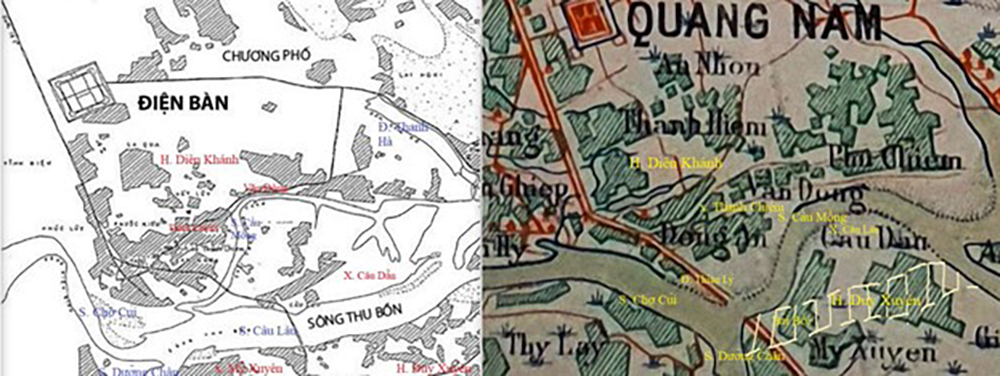 Ngay trong thời Pháp thuộc, trong vòng 14 năm kể từ 1916, sự thay đổi về địa lý cũng rất rõ ràng. Hãy xem hai Hình 29 sau đây gom gọn hai Hình 7 (bên phải) và Hình 27 (bên trái) và xếp chúng gần bên nhau. Mục đích chính là để dễ bề quan sát sự thay đổi trong địa hình của vùng nam Điện Bàn, nhất là khi hai con sông Câu Lâu và Cầu Mống đổi dạng trong vòng 14 năm trời.