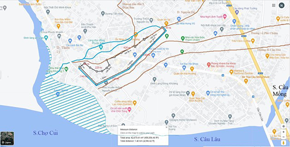 Để hội đủ các điều kiện trên, chiều rộng ngoại thành rất có khả năng khoảng 500 m – đó là chiều dài trên khúc quẹo tuyến đường Thiên Lý để bao phủ luôn cả nội thành. Sau khi cho vào tỉ số mà ông Chapman đưa ra, đó là chiều rộng bằng 2/3 chiều dài. Vì thế, chiều dài có thể lên đến 750 m. Dùng Google Map, ngoại thành Dinh Chiêm có thể giống như sau – hãy xem Hình 31.