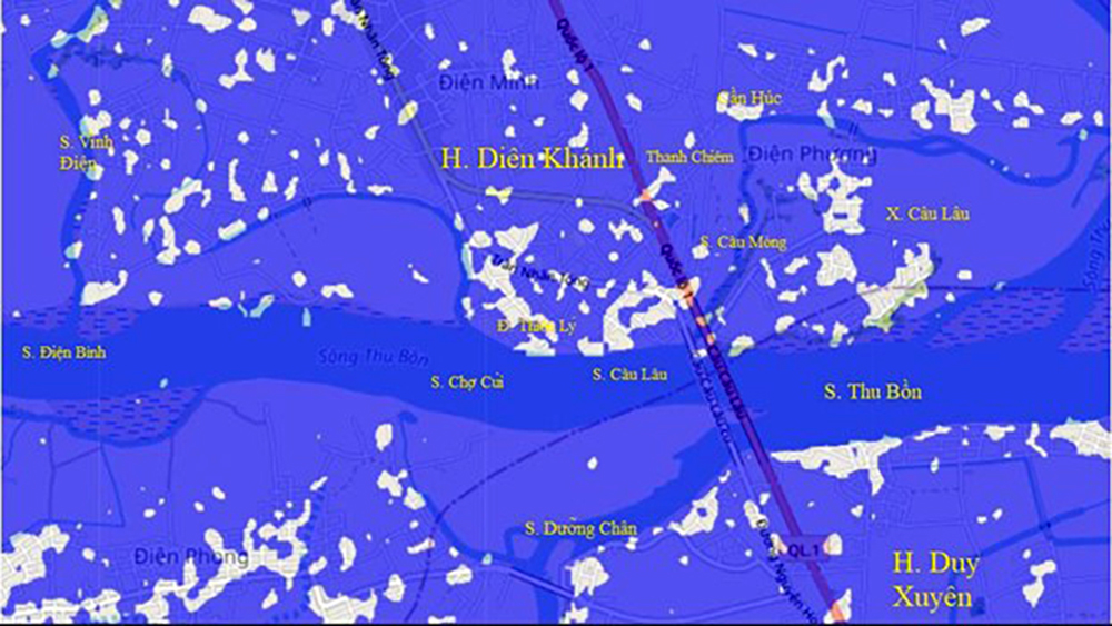 Nhìn vào Hình 17 chúng tôi nhận thấy rằng địa hình Nam Điện Bàn và sông ngòi hiện nay (2023) đang trong Chu Kỳ 3 – Hãy xem Bảng 3. Trong chu kỳ này, Sông Cầu Mống gần như khô cạn. Số lượng nước chảy từ Sông Câu Lâu và Dưỡng Chân chảy vào nó rất it ỏi. Hình 17 cũng cho thấy hai con đường Quốc Lộ (QL) xưa và nay. Đường đất Thiên Lý (còn gọi là đường Cái Quan) là tuyến đường cũ kĩ nhất nằm cuối cùng gần bờ sông Chợ Củi nhất; tuyến đường thứ hai là đường Nguyễn Hoàng trước đây là QL-1 được xây cất từ thời Pháp thuộc vào khoảng 1925; còn con đường QL-1A được xây cất trong khoảng thời gian gần đây (sau 2000). Trong công cuộc tìm kiếm Trạm Thương Khách, chúng tôi chỉ muốn để ý đến con đường cổ Thiên Lý mà thôi vì hai tuyến đường Quốc Lộ được xây dựng và chỉ tồn tại về sau này. Chúng tôi cũng tiên đoán rằng vị trí của Trạm Thương Khách rất gần nội thành Dinh Chiêm. Vì tránh lụt lội, nó có thể cũng được xây trên một nền đất cao hơn chung quanh. May thay, chúng tôi đã tìm thấy một website lấy tên là www.floodmap.net cho biết độ cao của đất đai cả thế giới bao gồm cả Việt Nam. Khi chúng tôi vào website và đặt chiều cao của mặt nước sông là 11 m, hầu hết cả vùng nam Điện Bàn đầu nằm dưới mặt nước, ngoại trừ một vài nơi như Thành Điện Bàn, dọc tuyến đường Thiên Lý và xã Đông An. Điều này cho thấy rất có thể Trạm Thương Khách nằm dọc theo tuyến đường Thiên Lý vì, theo chúng tôi nghĩ, trong đầu thế kỷ 17, con đường đất này nằm sát theo bờ sông Chợ Củi. Hơn nữa, trạm khách này nằm kế bên cạnh các con đường đường bộ nếu đi bằng xe ngựa. Sau đây là các vùng đất cao ở miền nam Điện Bàn mà website này cho biết (Hình 32):
