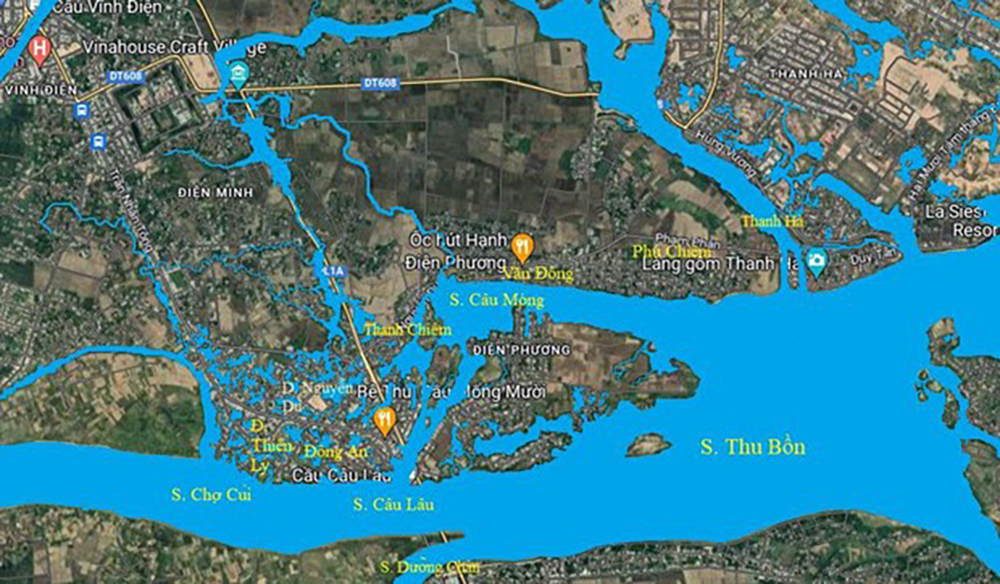 Bắt tay vào công việc chính, chúng tôi tìm kiếm một bản đồ chụp từ vệ tinh trong Google Map cho miền nam Điện Bàn (Hãy xem Hình 34) và bắt đầu công việc tìm ra những đầm, hồ và sông. Điều ngạc nhiên là hình dáng các sông ngòi xưa và nay hiện ra rất rõ, kể cả các đầm lầy và hồ ao. Từ hình vệ tinh, chúng tôi có thể thấy phường Điện Phương bị chia ra hai phần đông và tây bởi con sông Cầu Mống. Cũng giống như những gì vẽ trong Tranh Chaya (1640), sông ngòi ngày xưa rất rộng kể cả sông Cầu Mống, sông Câu Lâu và sông Chợ Củi. Chúng tôi cũng nhận thấy hình chụp vệ tinh rất ăn khớp với hình ảnh lấy ra từ floodmap.net. Nói chung là miền nam Điện Bàn ngày xưa loang lổ đầm lầy với gò bồi khắp nơi. Muốn tìm kiếm một nơi cao ráo để dựng một dinh thự lại gần bờ sông và đường bộ cho thuận tiện lưu thông thật khó khăn. Nghĩ về Chúa Nguyễn Hoàng (1525-1613) khi đi ngang qua Cần Húc có lẽ rất hài lòng về địa thế vùng này vì nó nằm trên một vùng đất cao, lại gần sông Cầu Mống, cách Hội An không xa (khoảng 5, 6 cây số) nên cuối cùng quyết định đặt lỵ sở dinh trấn Quảng Nam tại đây. Nơi đây chính là xã Cần Húc. Có lẽ điều ngài không thể ngờ là nạn lụt lội ở miền nam Điện Bàn xảy ra rất thường xuyên. Có khi nước lủ kéo đến phá bờ sông, chọc thủng đất đai, thay đổi đường hướng trước kia của sông Cầu Mống. Và chính vì lý do này, theo chúng tôi nghĩ, ngài mới di dần Dinh Chiêm về phía tây nam đi theo con đường đất chạy đến bờ sông Chợ Củi.