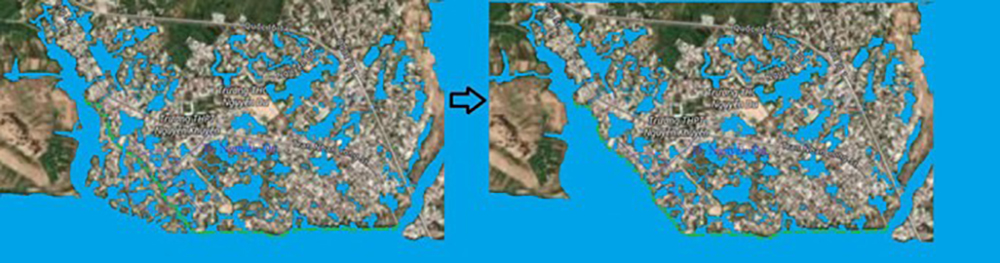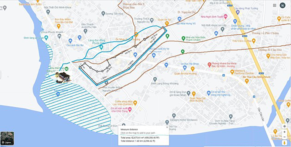 Công việc kế tiếp là tìm kiếm bờ sông Chợ Củi nằm phía tây nam Điện Bàn, gần tuyến đường Thiên Lý chạy song song theo bờ sông. Xem xét kỹ lưỡng các cồn bồi nằm phía bên trái tuyến đường Thiên Lý, chúng tôi nhận thấy một đường ranh giới mờ nhạt do phù sa bù đắp. Theo đó, chúng tôi dùng mực xanh lá cây vẽ theo và tẩy sạch các gò bồi ngoài con đường ranh giới này. Chúng tôi tin tưởng rằng mình đã tìm ra bờ sông Chợ Củi đầu thế kỷ 17. Hãy xem Hình 35.