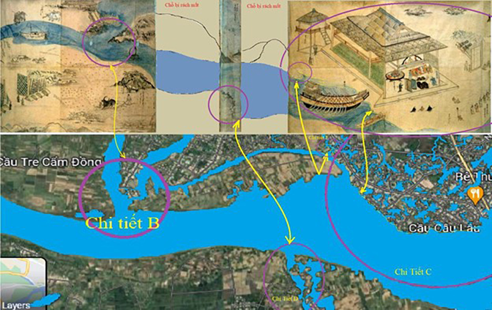 Bây giờ hãy ghi nhận Chi Tiết B, C, D và E trong Tranh Chaya rồi so so sánh từng vị trí một với hình vệ tinh Google Map:
