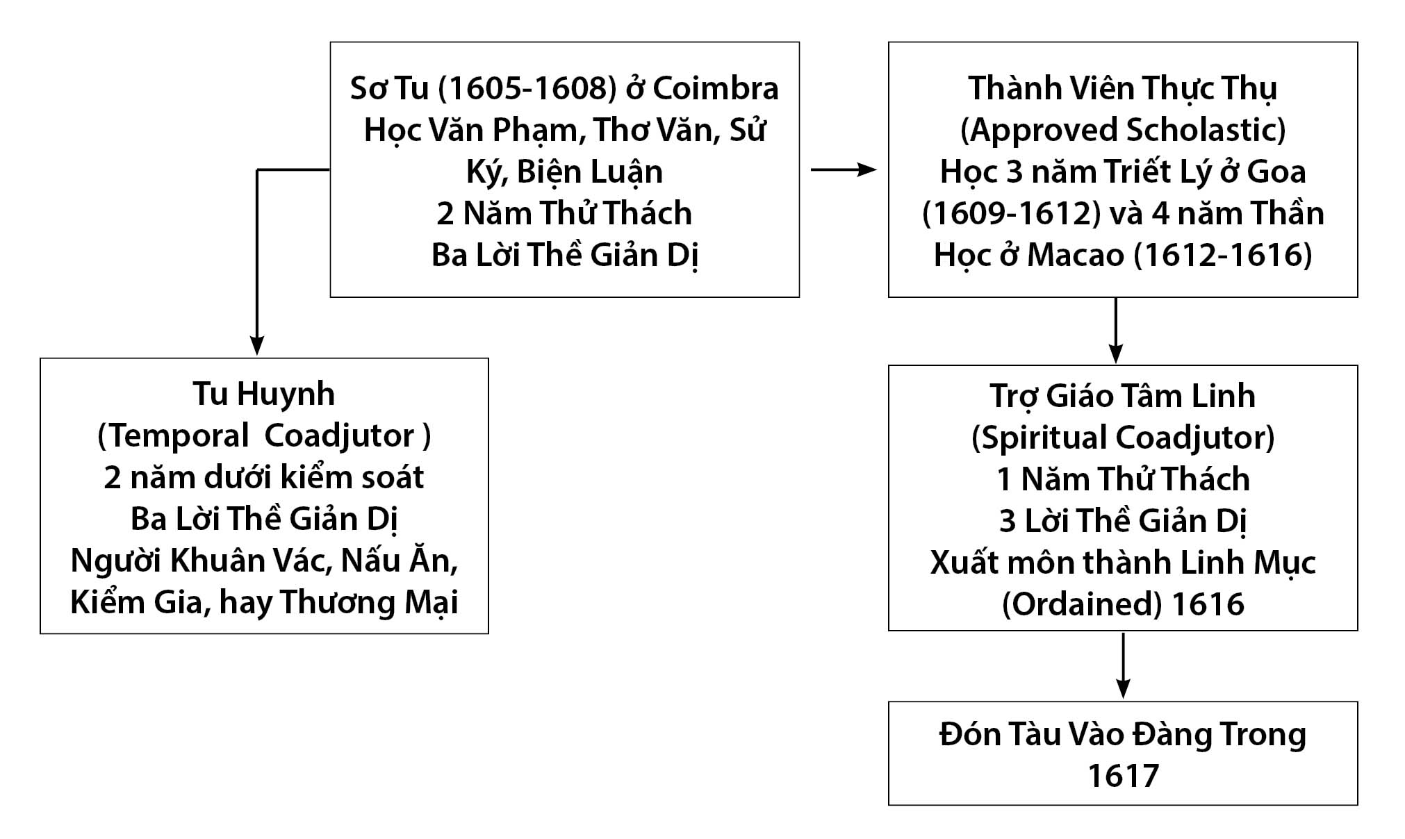 Nên chú ý rằng ngoài con đường tu hành để trở thành một Giáo Sĩ trong Hình 4 còn cho thấy con đường lựa chọn khác của một trong nhà Dòng Tên, đó là giáo chức phụ tá gọi là Temporal Coadjutor. Dĩ nhiên, Pina không theo con đường tu hành này. Riêng Temporal Coadjutors là những người theo đạo và tình nguyện tuân theo nội qui của Dòng Tên, nhưng vì họ thiếu học thức không thể theo được con đường học vấn để trở thành một vị Giáo Sĩ. Vì thế, suốt đời họ chỉ có thể là những tu huynh (Lay Brothers) trong nhà dòng. Họ theo đạo và sẽ trở thành những tu sĩ trông lo việc trần tục trong nhà Dòng như là quản lý, khuân vác, quản gia, nhà bếp, làm vườn, v.v… Thí dụ điển hình là các tu sĩ Anh Paul Saito (1576-1633), Joseph Tsuchimochi (1568-?) và Diogo Dias (1578-?) tháp tùng theo phái đoàn dẫn đầu bởi Cha Diogo Carvalho (1578-1624)16 và Cha Francesco Buzomi (1576-1639)17 đáp xuống cửa Hàn, Đà Nẵng năm 1615. Trong phái đoàn này, chỉ là những phụ tá temporal coadjutors. họ không có quyền giảng đạo hay giải tội mà chỉ vâng lời chỉ dạy và sai bảo của các cha bề trên trong những công việc nặng nhọc hằng ngày. Nhưng họ có thể ghi danh và theo đuổi việc học như những tu sĩ khác. Họ cũng có thể xin phép tách rời dòng Giê Su bất cứ lúc nào mà không phải chịu đựng thêm một nghĩa vụ hay hình phạt nào.