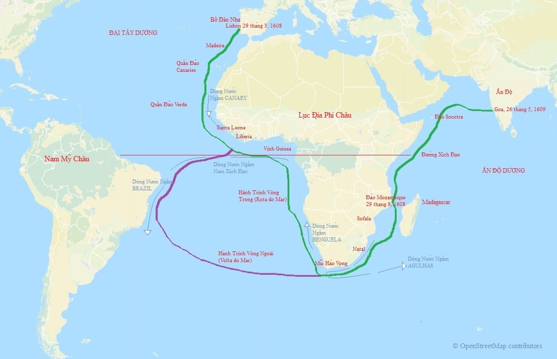 Dựa theo tiến trình gần 100 năm nay, người Bồ có thể tự tin đã quen thuộc với con đường biển đi qua Goa để mua gia vị. Nói chung, khi rời hải cảng Lisbon, đoàn thuyền buôn và chiến thuyền hộ tống sẽ theo dòng nước ngầm Canary chảy xuống phía nam. Dòng nước này sẽ di chuyển bên cạnh ba quần đảo: Madeira, Canaries và Cape Verde. Dựa theo chiều gió thổi, buồm sẽ căng ra. Thuận theo dòng nước biển Canary, thuyền theo gió đẩy thẳng họ xuống phía nam dọc theo bờ biển Phi Châu, gần Vịnh Guinea. Tuy nhiên, khi đến Cape Verde, dòng nước ngầm Canary sẽ chia ra làm hai ngả; một nửa sẽ đi về hướng tây và sát nhập với dòng nước ngầm Bắc Xích Đạo (North Equatorial Current) -Dòng nước này đi về phía tây, tây-bắc theo chiều kim đồng hồ. Trong khi đó, một nửa kia được đổi tên là dòng nước ngầm Guinea tiếp tục chảy dọc theo bờ biển các nước như Senegal, Gambia, Sierra Leon, v.v. chảy thẳng xuống Vịnh Guinea. Điều đáng lo ngại là sau khi qua khỏi Cape Verde, khí hậu cũng bắt đầu thay đổi hẳn. Nhiệt độ cũng như độ ẩm thấp bắt đầu gia tăng.