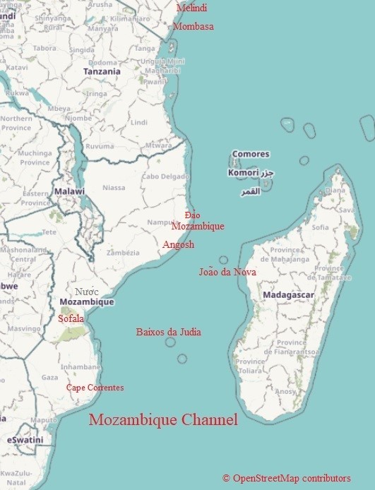 Ngồi trên tàu họ quên cả thời gian và không gian cho đến khi gió lặng, sóng yên. Qua một thời gian dài mà họ cảm tưởng như vô tận, nhìn vào thềm lục địa, các thủy thủ nhận định ra những con chim to bằng con ngỗng; màu trắng; nhưng chỉ riêng hai cánh chúng là màu đen trong khi mỏ và chân lại màu vàng. 1 Khi nhìn thấy chúng, họ đều thở dài, nhẹ nhõm vì họ đã nhận thức rằng họ qua khỏi nguy hiểm trên chặng đường này. Họ nhận thức rằng mình đã đến Mũi Agulhas, một nơi sóng lặng, gió đừng. Tuy nhiên, tất cả mọi người đều biết rằng nguy hiểm vẫn còn đang rập rình trước mặt. Tiếp tục tiến bước vào ngưỡng cửa của eo biển Mozambique, tập đoàn chỉ huy trên Vencimento cảm thấy hồi hộp vì họ biết họ phải tranh đấu kịch liệt với dòng nước ngầm Agulhas chảy mạnh dưới lòng biển. Trong eo biển Mozambique, nó có khuynh hướng chảy về hướng nam, tây nam dọc theo bờ biển South Africa và khi chảy đến Mũi Agulhas, nó đẩy con thuyền ngược về hướng đông để trở thành dòng Agulhas Chảy Ngược (Agulhas Return Current). Vì thế, thuyền trưởng phải khéo léo sát nhập vào dòng nước chảy ngược này và cố gắng lèo lái con thuyền vào giữa ngưỡng cửa của eo biển. Rất tiếc việc hải hành lúc bấy giờ rất khó khăn. Họ không thể tính ra được tọa độ của chiếc thuyền buồm vì thiếu dụng cụ tiên đoán về kinh độ -Thật ra họ muốn giữ vị trị con tàu chính giữa bờ biển Đông Phi Châu và đảo Madagascar. Tiến bước về hướng bắc, đầu tiên họ vào vùng Natal (bây giờ là South Africa) u ám; trời mù mịt như “ban đêm”. 2 Tiếp theo đó, càng đến gần đảo Mozambique, họ lại càng phải cẩn thận hơn vì ngay giữa eo biển có vài cụm san hô như Baixos da Judia (Jewish Shoals) 3 hay João da Nova 4 nhấp nhô trên mặt nước, có thể gây ra cảnh mắc cạn bất cứ lúc nào. Vì thế, khi vào đến vùng biển từ khoảng cách Sofala (nay gần Beira) đến Mozambique, họ phải hết sức cẩn thận và cố tình tránh xa những cồn cát này (Hãy xem Hình 9).