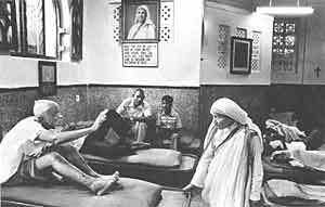 Nhà cho người hấp hối của chúng tôi ở Calcutta hồi trước là chỗ cho những người hành hương nghỉ chân sau khi đến đền Kali. Sâu trong trung tâm bận rộn của vùng Kalighat của thành phố, những cơ sở của chúng tôi thực sự nối tiếp với ngôi đền. Về phía bên trái khi bạn bước vào, chúng tôi có khu cho các ông, và phía bên phải là cho phụ nữ. Những cửa sổ nhỏ và cao đem ánh sáng đến các phòng, gồm những dẫy giường, tất cả được phủ bằng bao ny lông xanh. Ở giữa hai khu là trung tâm y tế và nơi tắm rửa, và đàng sau là nhà bếp và nhà quàn. Trường học cho các em bụi đời ở trên mái, nơi các chị nữ tu ở.